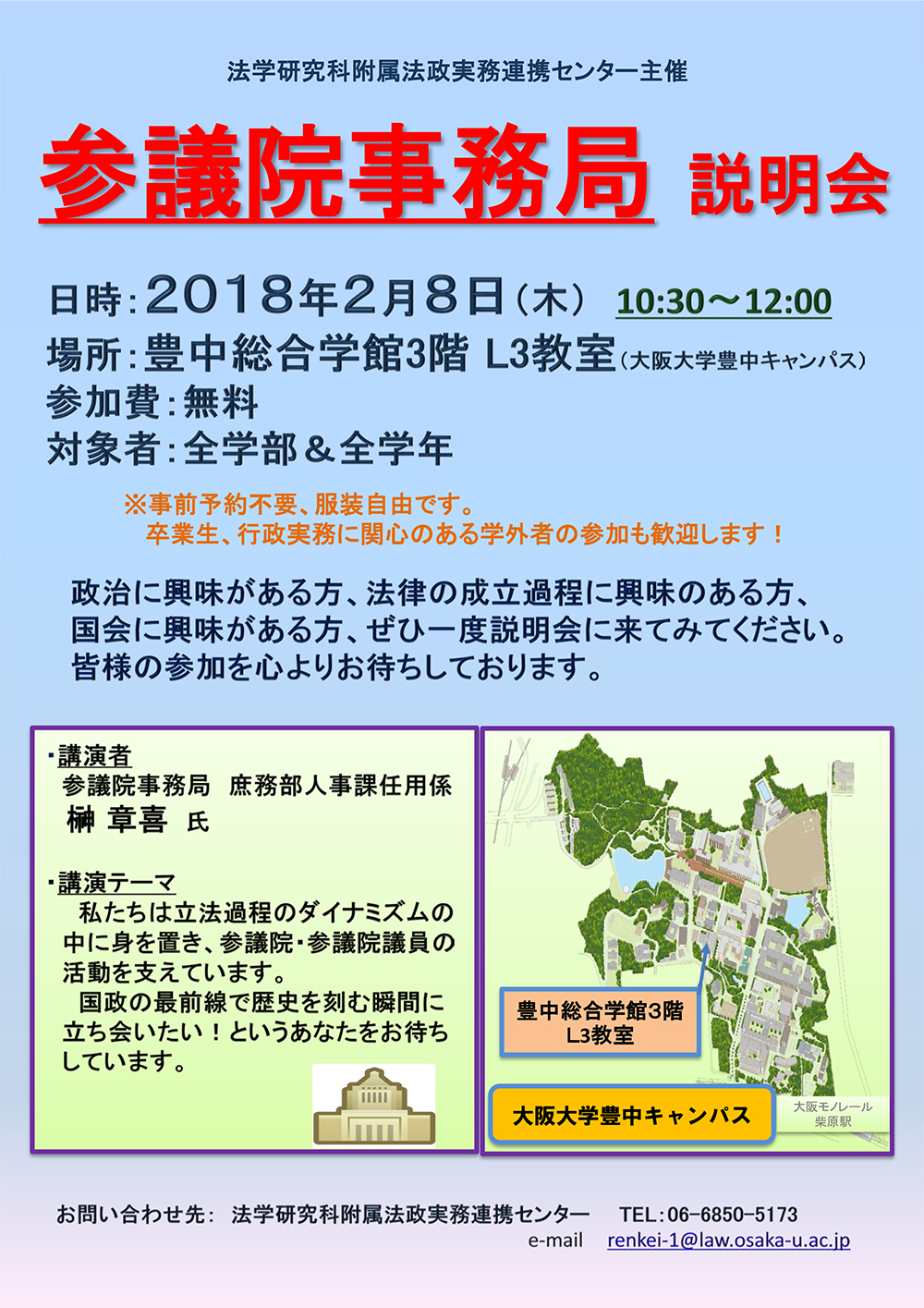 2月8日(木) 参議院事務局説明会 place 豊中キャンパス その他 カテゴリ その他 日時 2018年2月8日(木) 10時30分から12時00分まで 会場 豊中総合学館3階 L3教室 主催 法学研究科附属法政実務連携センター 申し込み窓口 申込不要 問い合わせ先 法学研究科附属法政実務連携センター <参議院事務局説明会開催> 講演者:参議院事務局 庶務部人事課任用係 榊 章喜 氏 場所:豊中総合学館3階 L3教室 *事前予約不要、服装自由です。 卒業生、行政実務に関心のある学外者の参加も歓迎します。奮ってご参加下さい。 Tweet これを送る 印刷する