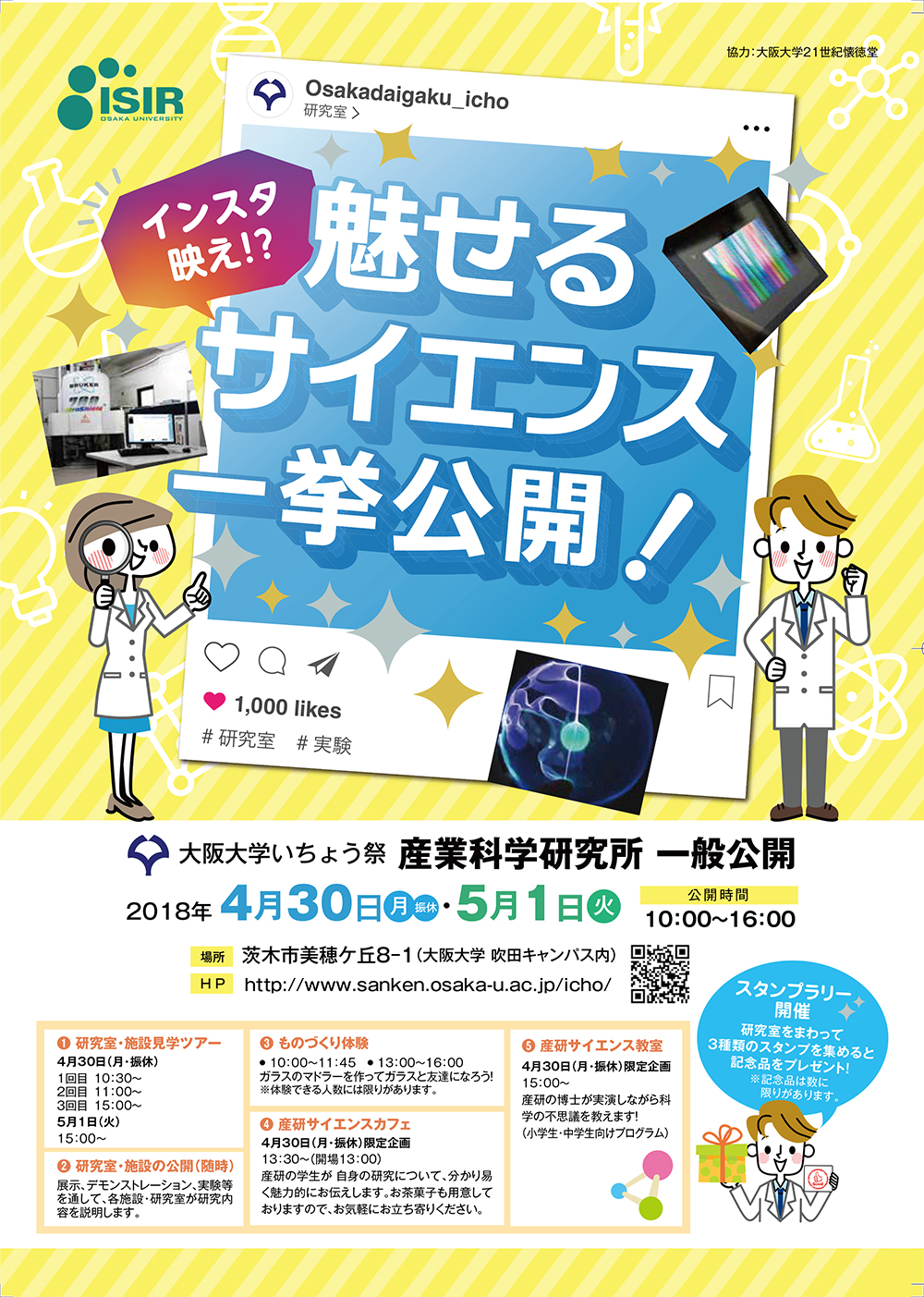 大阪大学創立記念祭いちょう祭の一環として、平成30年4月30日(月)、5月1日(火)の2日間、「インスタ映え!?魅せるサイエンス一挙公開!」をテーマに産業科学研究所を一般公開します。 両日ともに、楽しく施設内をご覧いただける各種イベントをご用意。新しい物質や材料、人工知能などの情報、生命現象に関る科学、ナノテクノロジーなど、ナノサイエンス、ライフサイエンス分野の日本の研究をけん引し発展を続ける「産研の今」を身近にご覧いただけます。当日は「研究室・施設の公開」、「所内見学ツアー」、産研の学生が自分たちの研究を紹介する「産研サイエンスカフェ(4/30限定)」、「ものづくり体験」、「スタンプラリー(3つのスタンプを集めると記念品に交換)」といったイベントに加え今回初めて小学生・中学生向けの科学実験イベント「産研サイエンス教室(4/30限定)」を開催します。 またインスタ映え!?のタイトルにちなんで、フォトプロップスも用意しています。ぜひ産研にお越しの際は写真撮影もお忘れなく!