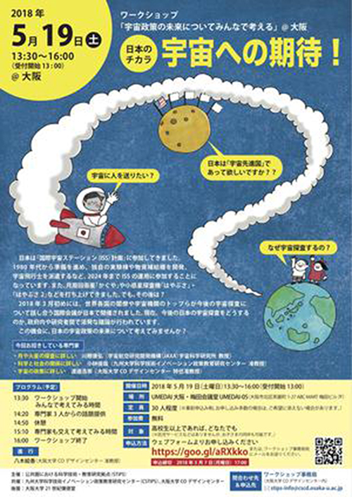 日本は「国際宇宙ステーション(ISS)計画」に参加してきました。1980年代から準備を進め、独自の実験棟や物資補給機を開発、宇宙飛行士を派遣するなど、2024年までISSの運用に参加することになっています。また、月周回衛星「かぐや」や小惑星探査機「はやぶさ」・「はやぶさ2」などを打ち上げてきました。でも、その後は? 2018年3月初めには、世界各国の閣僚や宇宙機関のトップらが今後の宇宙探査について話し合う国際会議が日本で開催されました。現在、今後の日本の宇宙探査をどうするのか、政府内や研究者間で活発な議論が行われています。 この機会に、大阪で、日本の宇宙政策の未来について考えてみませんか?