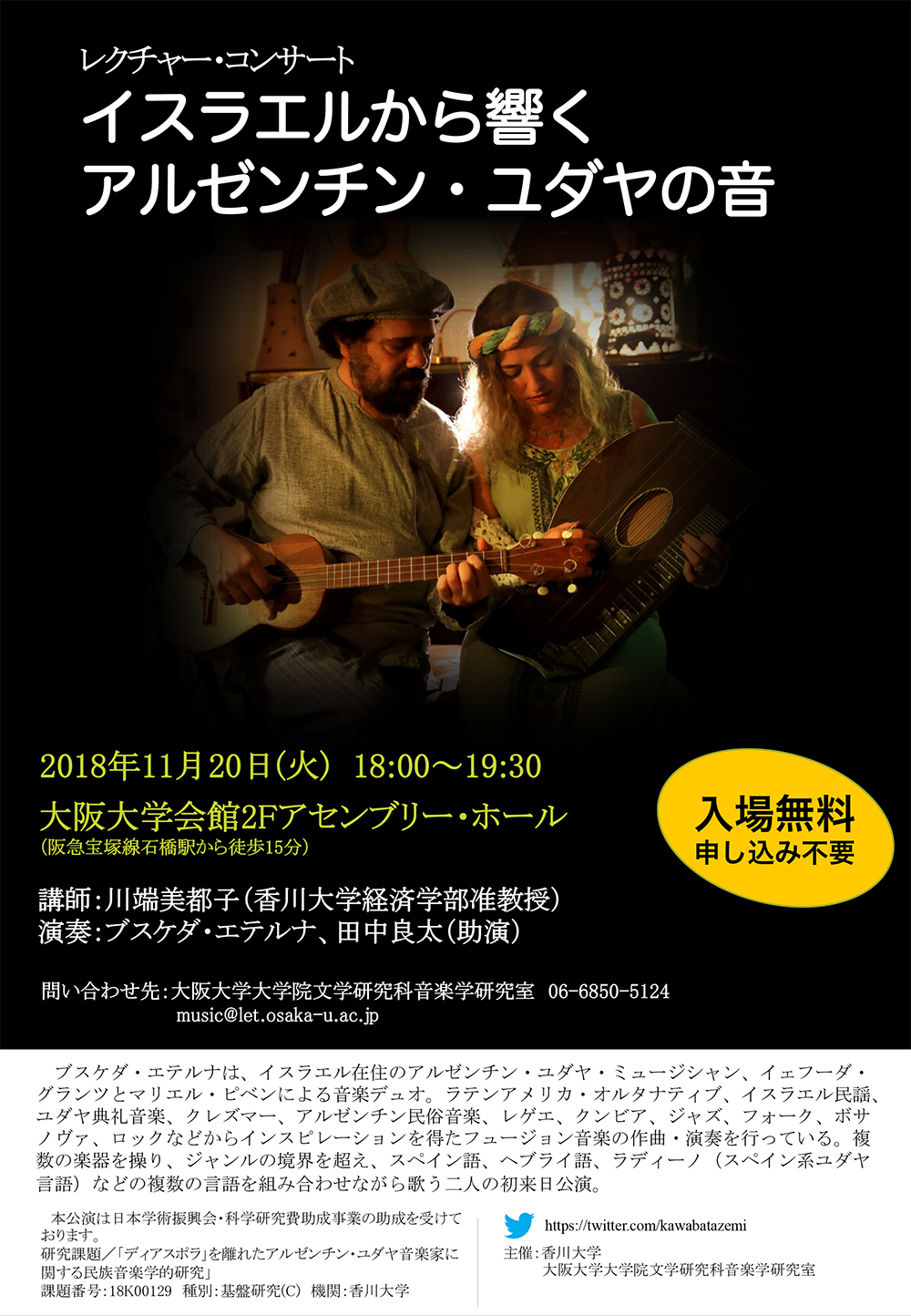 ブスケダ・エテルナは、イスラエル在住のアルゼンチン・ユダヤ・ミュージシャン、イェフーダ・グランツとマリエル・ピベンによる音楽デュオ。ラテンアメリカ・オルタナティブ、イスラエル民謡、ユダヤ典礼音楽、クレズマー、アルゼンチン民俗音楽、レゲエ、クンビア、ジャズ、フォーク、ボサノヴァ、ロックなどからインスピレーションを得たフュージョン音楽の作曲・演奏を行っている。複数の楽器を操り、ジャンルの境界を超え、スペイン語、ヘブライ語、ラディーノ(スペイン系ユダヤ言語)などの複数の言語を組み合わせながら歌う二人の初来日公演。