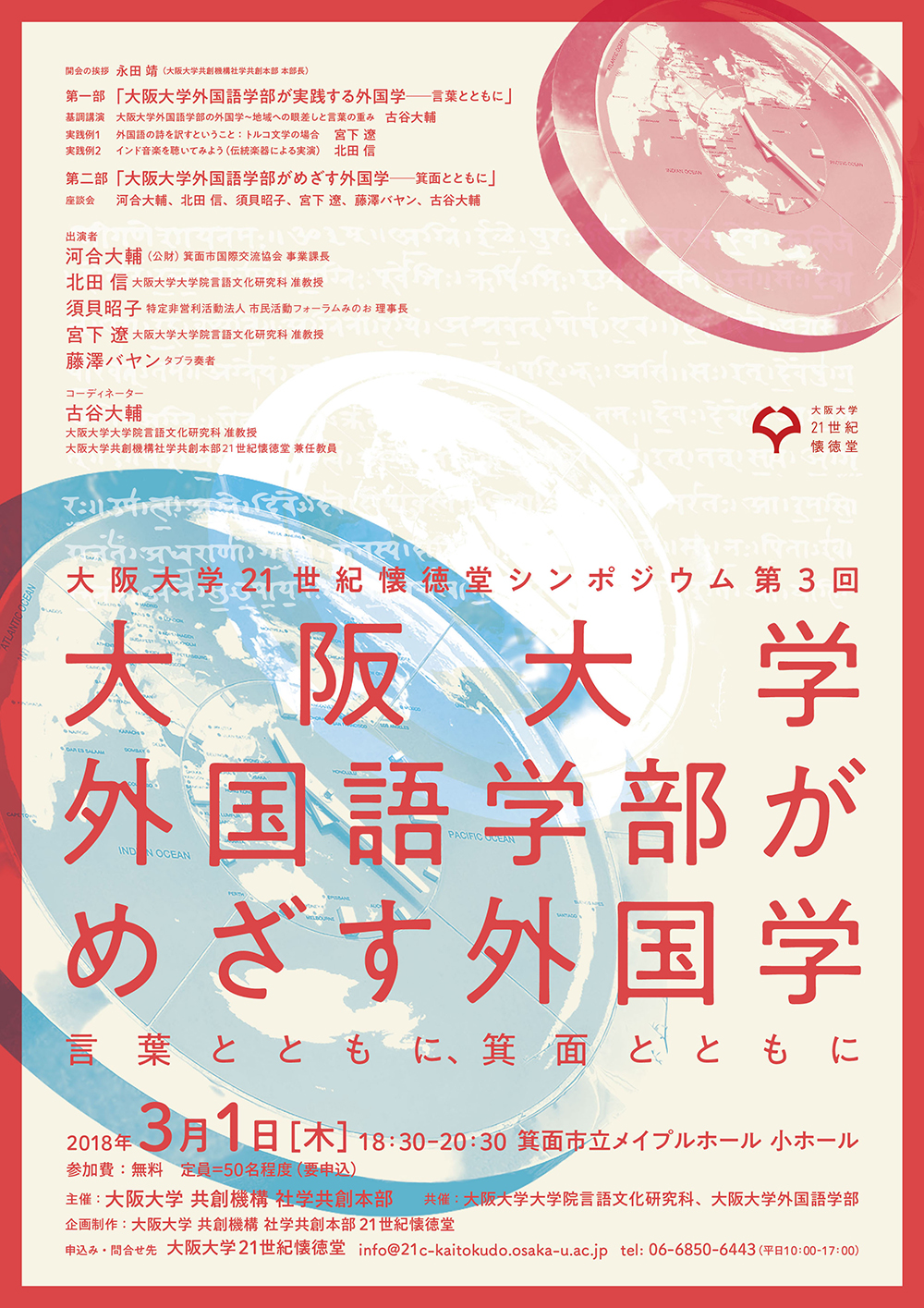 | 後援等 | 共催:大阪大学大学院言語文化研究科、大阪大学外国語学部 企画制作:大阪大学社学共創機構社学共創本部21世紀懐徳堂 |