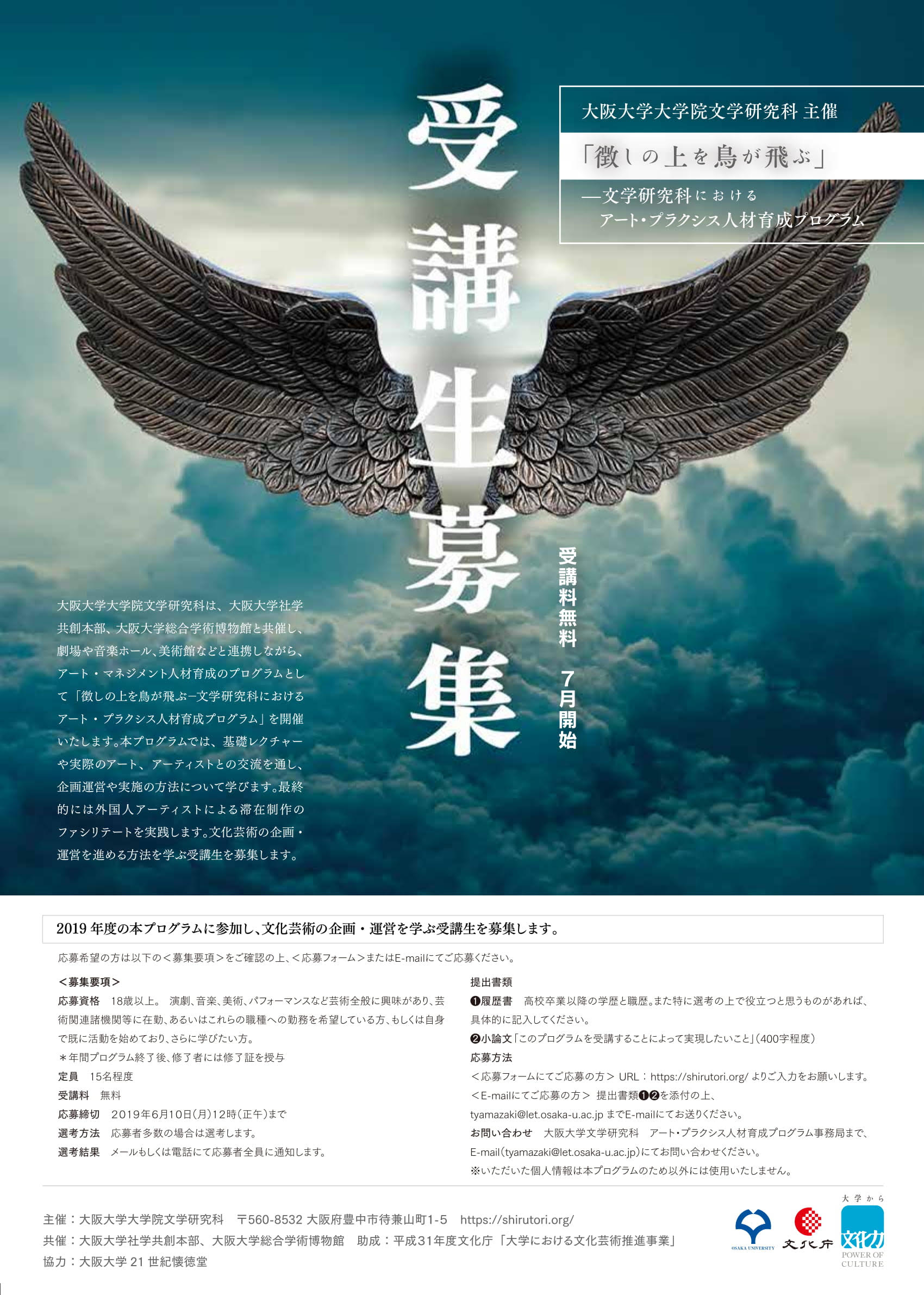 【受講生募集】大阪大学大学院文学研究科 主催「徴しの上を鳥が飛ぶ-文学研究科におけるアート・プラクシス人材育成プログラム」