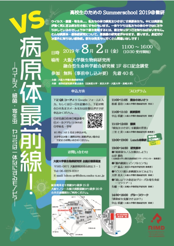 高校生のためのSummerSchool 2019@ 微研 「vs 病原体最前線 -ウイルス・細菌・寄生虫。 ヤツらは一体なにするモノぞ?」