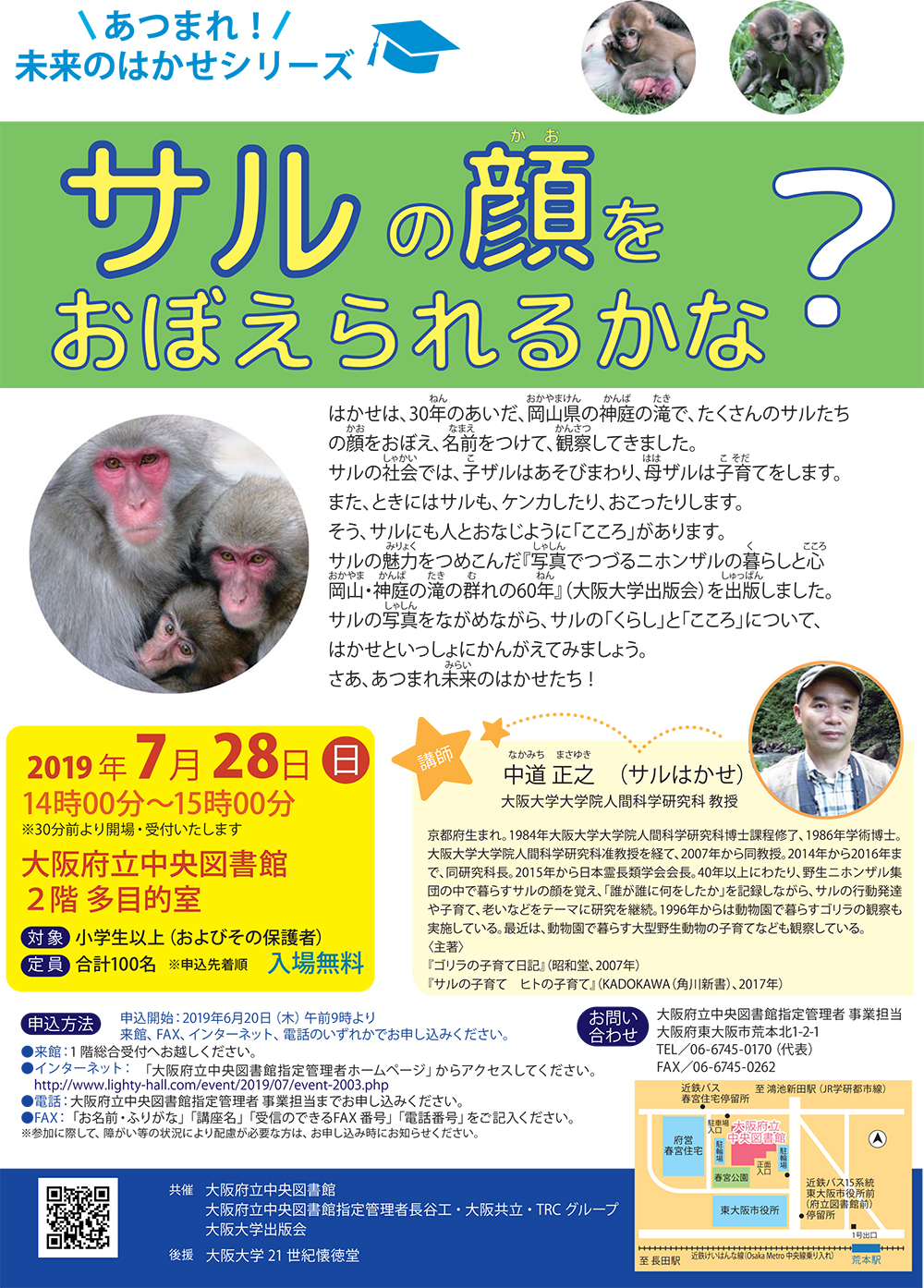はかせは、30年のあいだ、岡山県の神庭の滝で、たくさんのサルたちの顔をおぼえ、名前をつけて、観察してきました。 サルの社会では、子ザルはあそびまわり、母ザルは子育てをします。また、ときにはサルも、ケンカしたり、おこったりします。そう、サルにも人とおなじように「こころ」があります。 サルの魅力をつめこんだ『写真でつづるニホンザルの暮らしと心岡山・神庭の滝の群れの60年』(大阪大学出版会)を出版しました。 サルの写真をながめながら、サルの「くらし」と「こころ」について、はかせといっしょにかんがえてみましょう。 さあ、あつまれ未来のはかせたち !