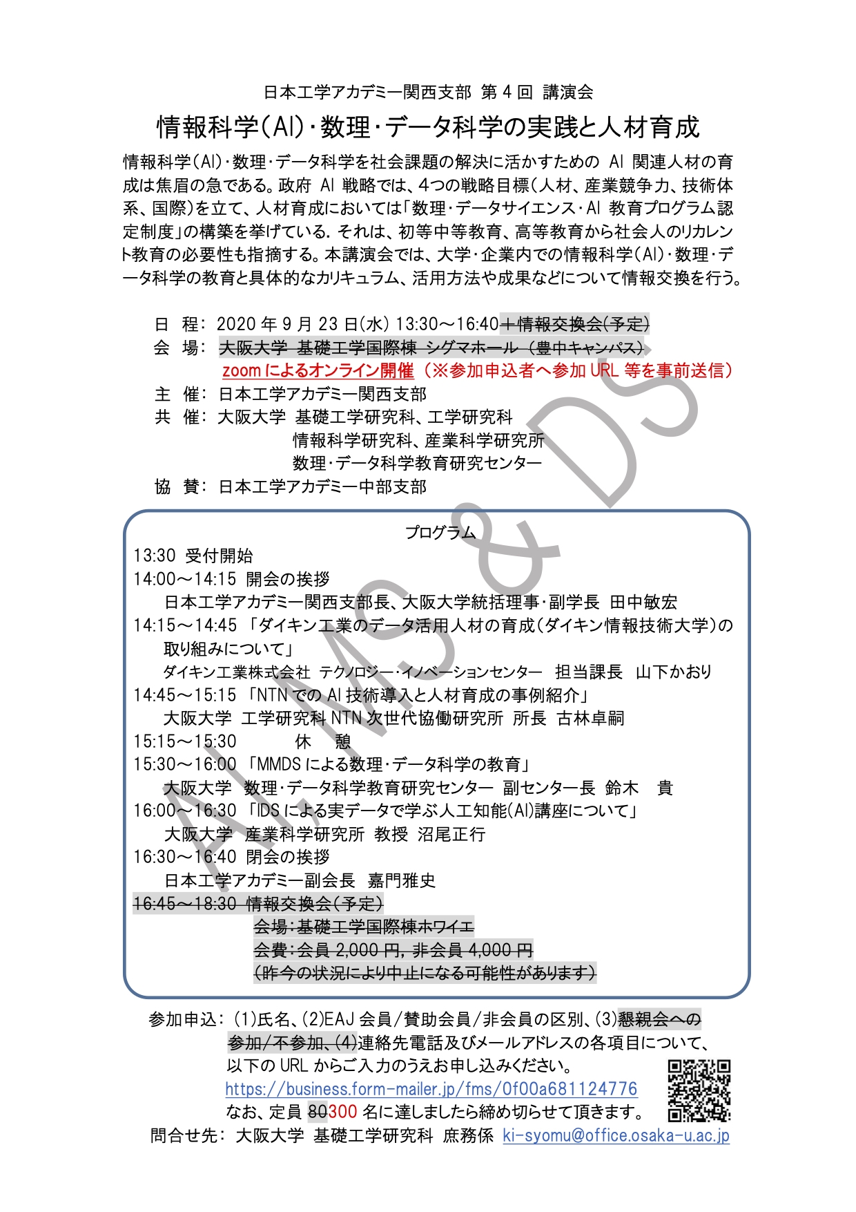 後援等 (共催)大阪大学 基礎工学研究科、工学研究科、情報科学研究科、産業科学研究所 、数理・データ科学教育研究センター/(協賛)日本工学アカデミー中部支部