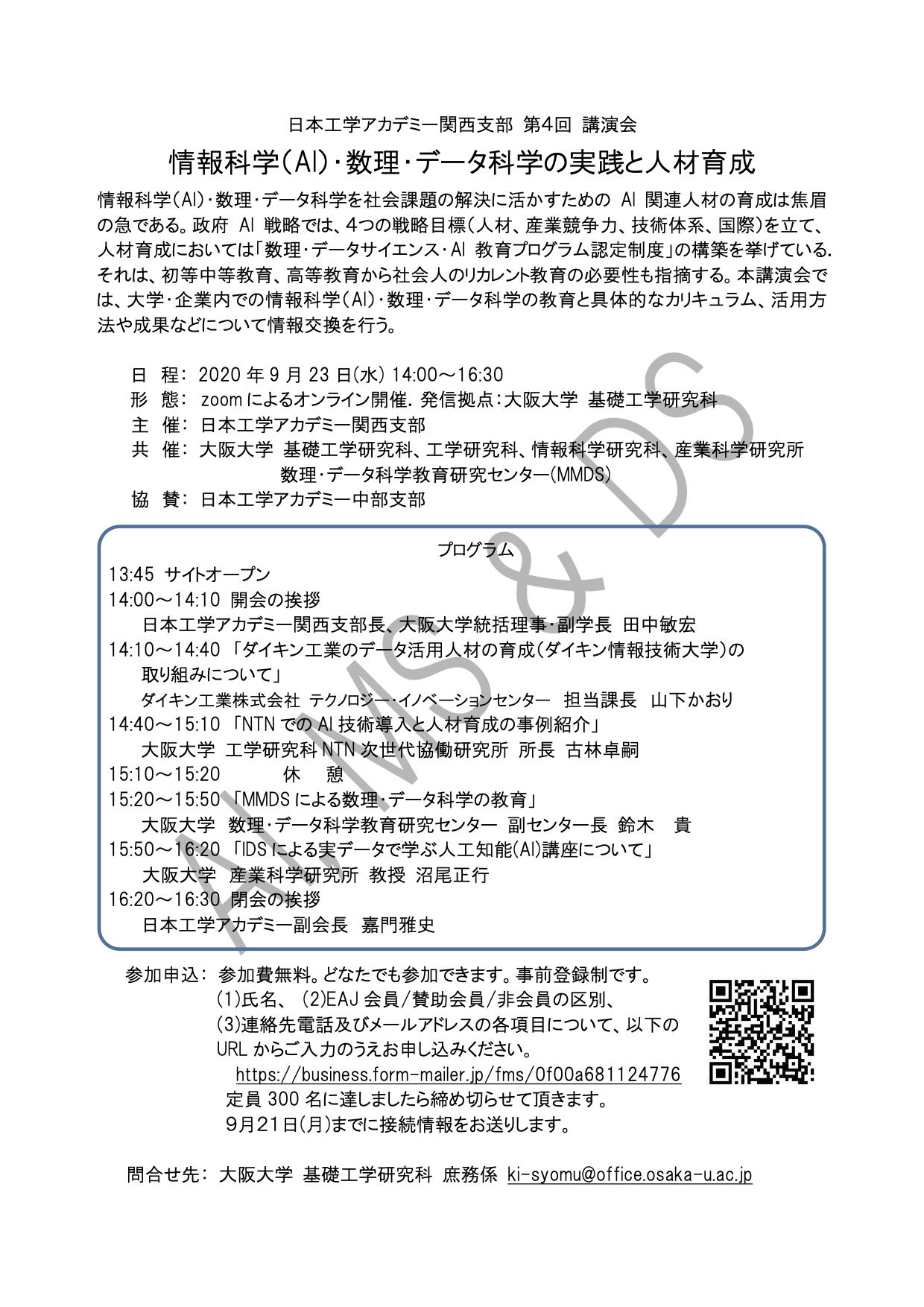 後援等 (共催)大阪大学 基礎工学研究科、工学研究科、情報科学研究科、産業科学研究所 、数理・データ科学教育研究センター/(協賛)日本工学アカデミー中部支部