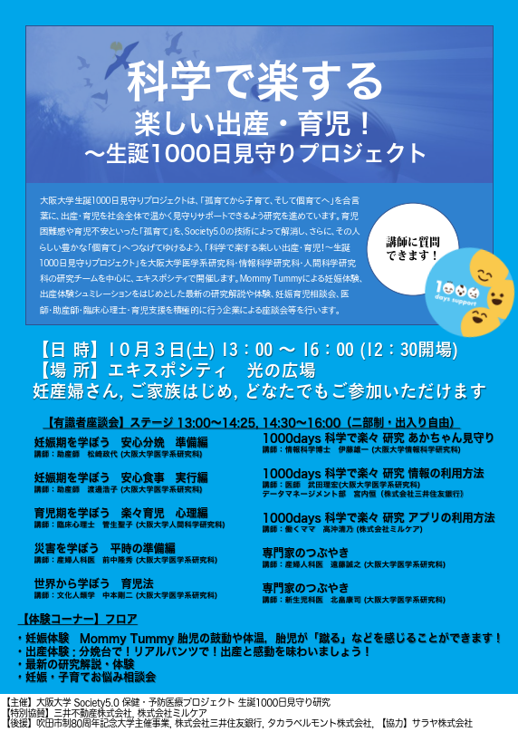 生誕1000日見守りプロジェクト(研究責任者木村正)では、「孤育てから子育て、そして個育てへ」を合言葉に、出産・育児を社会全体で温かく見守りサポートできるよう研究を進めています。育児困難感や育児不安といった「孤育て」を、Society5.0の技術によって解消し、さらに、その人らしい豊かな「個育て」へつなげてゆけるよう、「科学で楽する楽しい出産・育児!~生誕1000日見守りプロジェクト」を大阪大学医学系研究科・情報科学研究科・人間科学研究科の研究チームを中心に、エキスポシティで開催します。Mommy Tummyによる妊娠体験、出産体験シュミレーションをはじめとした最新の研究解説や体験、妊娠育児相談会、医師・助産師・臨床心理士・育児支援を積極的に行う企業による座談会を行います。子育てをしやすい社会を目指す仲間に、参加してみませんか?