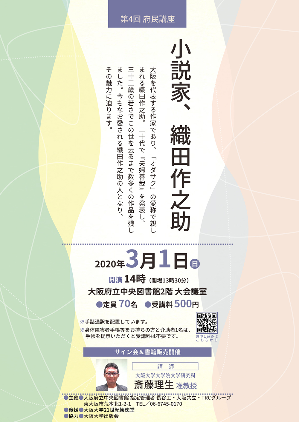 新型コロナウイルスの感染拡大防止のため、令和2年3月1日(日曜日)に開催を予定しておりました、第4回府民講座「小説家、織田作之助」は、中止とさせていただきます。