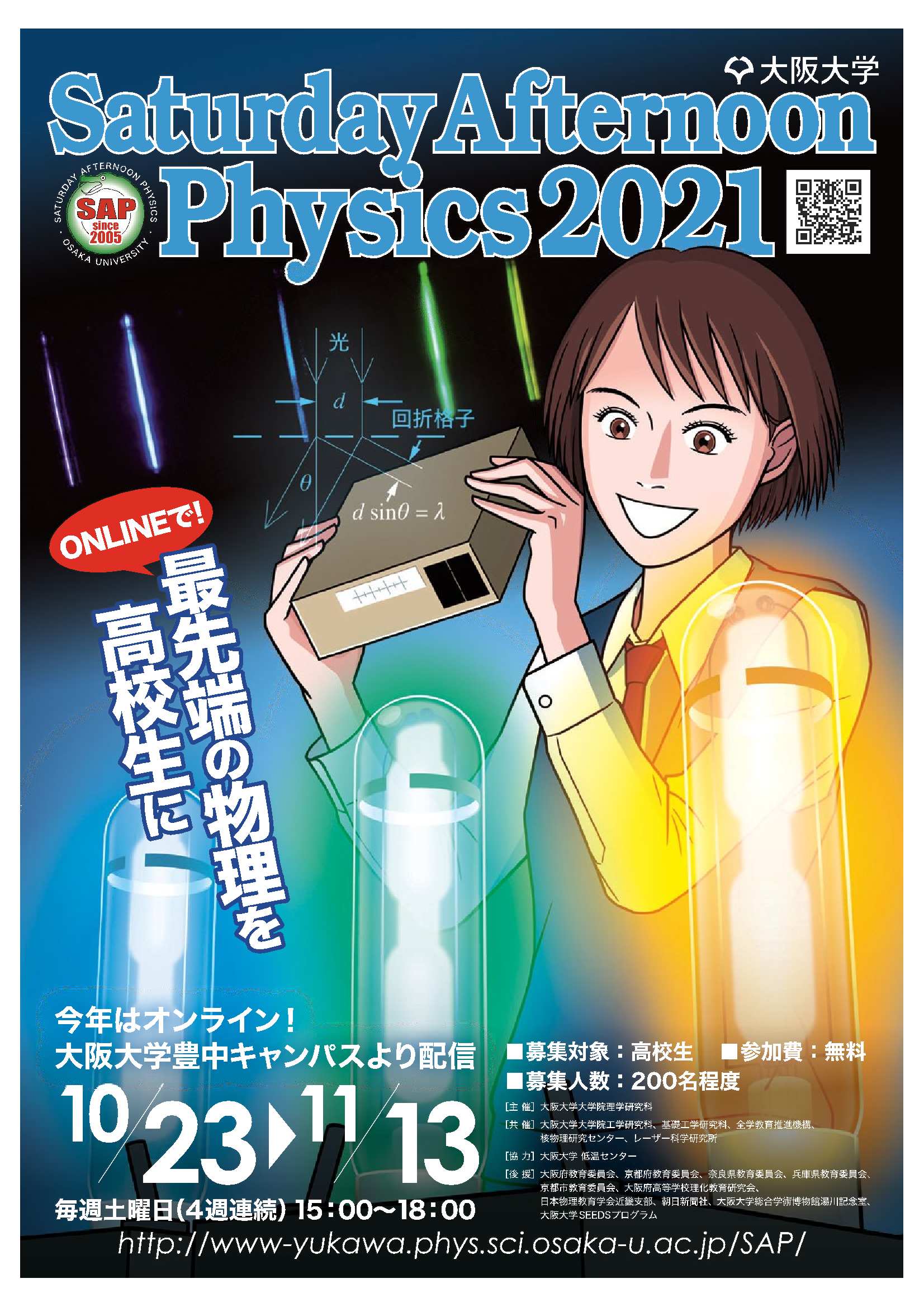 Saturday Afternoon Physics(SAP)は、主に高校生を対象に、第一線の研究者が最先端の物理を分かりやすく講義するとともに、様々な実験のデモなどを取り入れ、物理、科学、およびその応用、実用化に対する興味を引き出そうというプロジェクトです。 今年は10月23日から11月13日まで、毎土曜日午後3時から6時まで4週にわたりオンラインにて開催いたします。