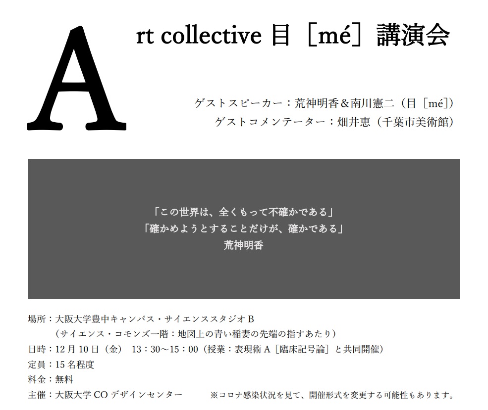 近年、「わかりやすく説明すること」や「短時間で学びのあるプレゼン」といった知的に負担の少ない読み物やコンテンツがもてはやされています。 しかし、私たちが生きている複雑で理不尽で不確かなこの世界は、そんなに簡単に〈わかってしまう〉ものなのでしょうか。 「わかりやすくする」「わかった気になる」「わかったふりをする」ことで私たちはこの世界に対する感度を失っていっているかもしれません。 今回、来ていただくアート集団「目」はこの不確かな世界への感度を高めて、わかった気になっていたもの・ことをわからなくする作品を作り続けています。その制作活動から〈わからないもの・こと〉への向き合い方を語っていただきます。 (担当教員:山森裕毅 COデザインセンター 特任講師)