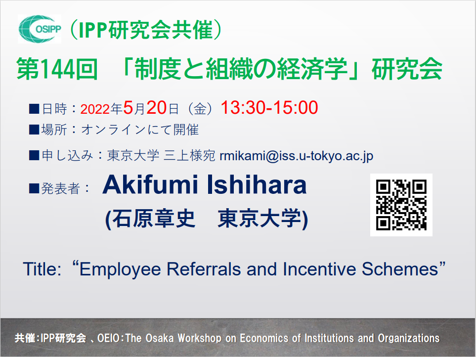 第144回「制度と組織の経済学」研究会(東京大学社会科学研究所とIPP研究会の共催)開催のお知らせ 「制度と組織の経済学」研究会はOEIO(The Osaka Workshop on Economics of Institutions and Organizations:東京大学社会科学研究所と大阪大学IPP研究会による研究会)の主催により、理論研究・実証研究を問わず、ミクロ経済理論、マクロ経済理論、経済史などをテーマに研究しています。 皆様のご参加をお待ちしております。
