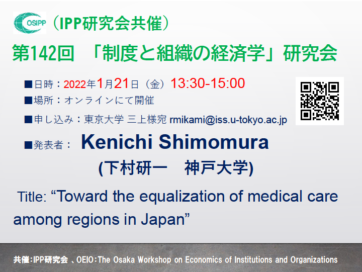 第142回「制度と組織の経済学」研究会(東京大学社会科学研究所とIPP研究会の共催)開催のお知らせ 「制度と組織の経済学」研究会はOEIO(The Osaka Workshop on Economics of Institutions and Organizations:東京大学社会科学研究所と大阪大学IPP研究会による研究会)の主催により、理論研究・実証研究を問わず、ミクロ経済理論、マクロ経済理論、経済史などをテーマに研究しています。 皆様のご参加をお待ちしております。