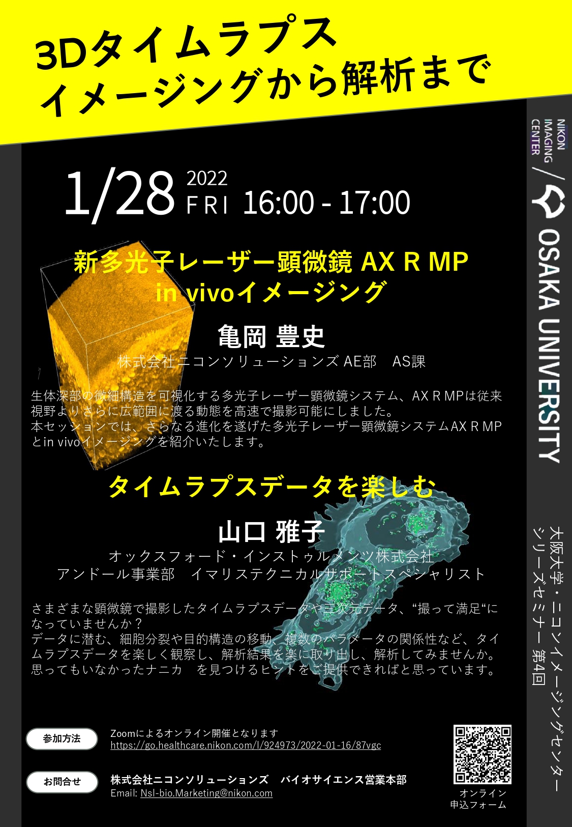 2022年1月28日 シリーズセミナー 第4回 「3Dタイムラプス イメージングから解析まで」 本センターは、世界で初めての“生体イメージング”にフォーカスした本格的なイメージング施設です。様々なイメージング研究にふれる機会をご紹介するため、生体イメージング研究で活躍する研究者による「大阪大学・ニコンイメージングセンター シリーズセミナー」を開催いたします。 第4回は、株式会社ニコンソリューションズ 亀岡様 より「新多光子レーザー顕微鏡 AX R MP in vivoイメージング」、オックスフォード・インストゥルメンツ株式会社 山口様より「タイムラプスデータを楽しむ」 をご講演いただきます。 皆様のご視聴をお待ちしております。※今回はWeb視聴のみのセミナーとなっております。