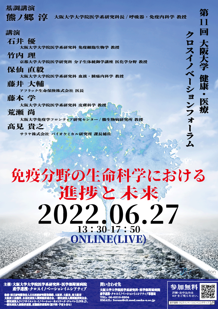 「大阪大学 健康・医療クロスイノベーションフォーラム」は、“関西から、国際展開を見据えた健康・医療分野における研究開発や事業化を強力に推進していく”ことを目的に、大阪大学と様々な事業業態の方々が、企業間・組織間の垣根を越え、協働・共創するクロスイノベーションを創発することを目指して開催しております。第11回目の今回は、大阪大学の特色の一つであります「免疫」の分野に着目し、世界トップレベルの最先端研究を行っている著名な研究者を擁する本学の免疫研究の成果について共有、議論を深めることで、withコロナの社会状況の中で、新たなイノベーションの創出やより一層の産学連携による研究開発の推進につながることを期待しています。