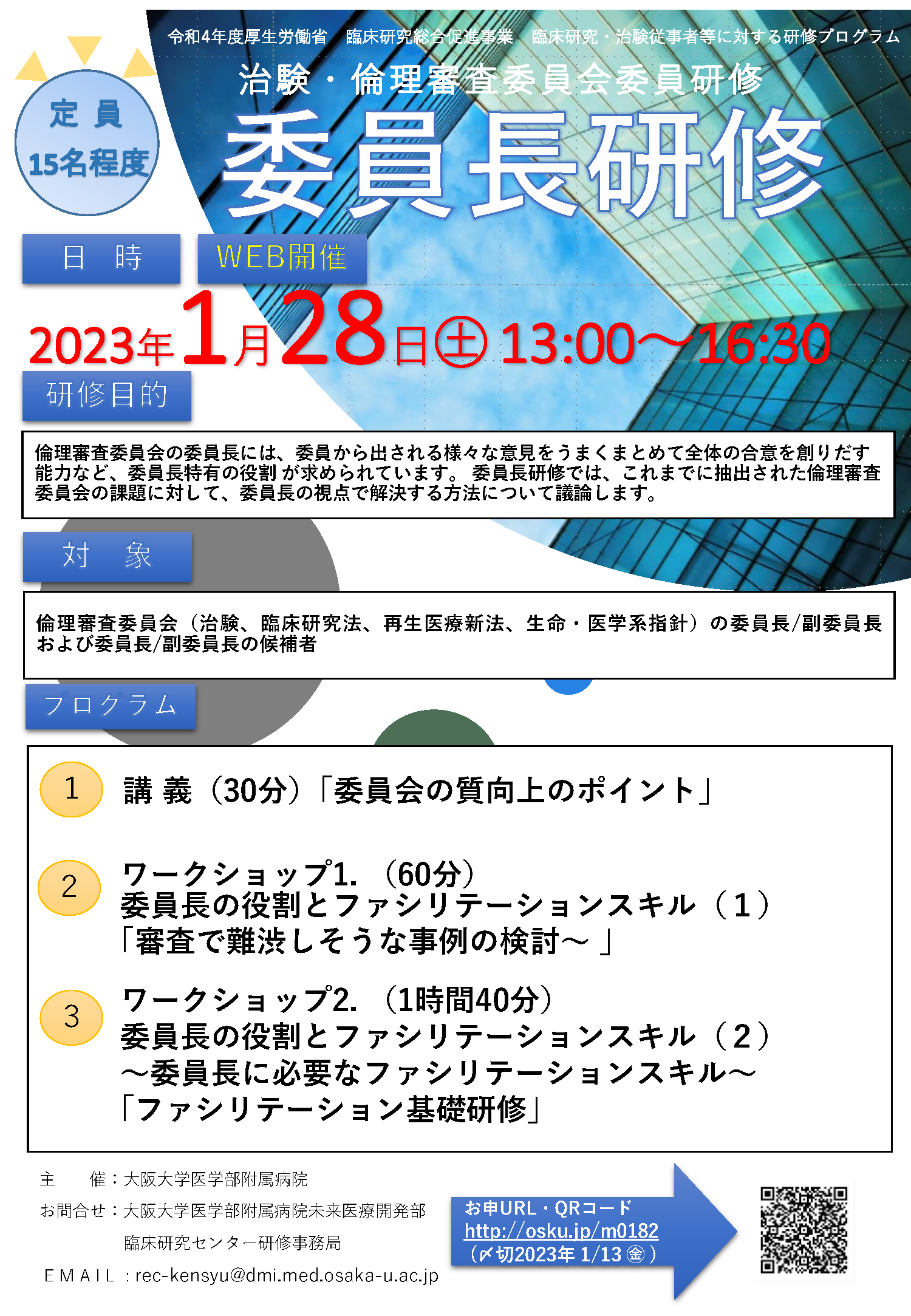 大阪大学医学部附属病院未来医療開発部臨床研究センター研修事務局 電話:070-2904-2720 |