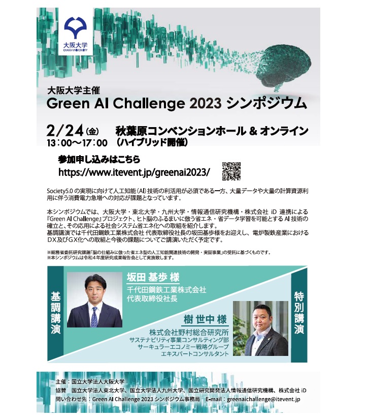 Society5. 0の実現に向けて人工知能(AI)技術の利活用が必須である一方、大量データや大量の計算資源利用に伴う消費電力急増への対応が課題となっています。 本シンポジウムでは、大阪大学・東北大学・九州大学・情報通信研究機構・株式会社iD 連携による『Green AI Challenge』プロジェクト、ヒト脳のふるまいに倣う省エネ・省データ学習を可能とするAI技術の確立と、その応用による社会システム省エネ化への取組を紹介します。基調講演では千代田鋼鉄工業(株)代表取締役社長の坂田基歩様をお迎えし、電炉製鉄産業におけるDX及びGX化への取組と今後の課題についてご講演いただく予定です。