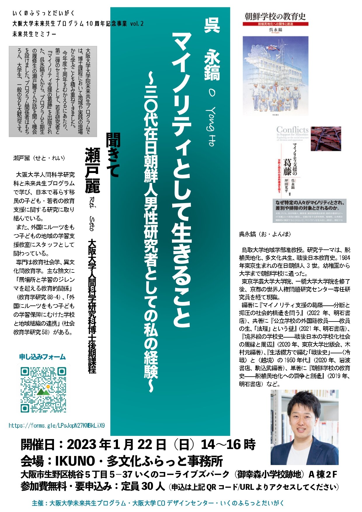 第2回 マイノリティとして生きること~三〇代在日朝鮮人男性研究者としての私の経験~ 人間科学研究科、未来共創センターとの連携した人社系社会実践力育成プログラム開発の一環として、大阪生野を拠点とする大学院生・修了生の参画する社会実践プロジェクト「いくのふらっとだいがく」の連続セミナーを開催します。第二弾のセミナーとして、若手研究者と『マイノリティ支援の葛藤』を出版された呉永鎬さんから、未来共生プログラム5期生の瀬戸麗さんが話を聞くかたちのイベントが開催されます。プログラム関係者はもちろん、大学生、一般の方も大歓迎です。