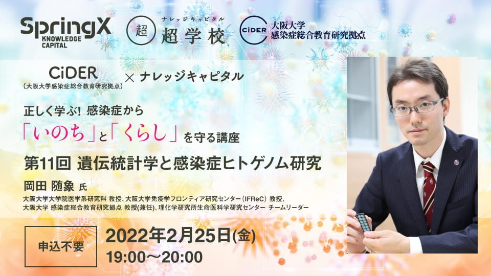 本講座は、新型コロナウイルスを始めとする感染症の脅威から人々の「いのち」と「くらし」を守るために、科学的根拠に基づいた感染症対策やリスク、ワクチンの開発状況に加えて、感染禍が人々の行動に与えた影響の分析などの幅広い話題について、大阪大学の研究者が、中学生から大人までを対象にわかりやすく解説する全12回のオンラインプログラムです。 今回の講師は、大阪大学大学院医学系研究科の岡田 随象教授((兼)大阪大学免疫学フロンティア研究センター 教授、(兼)大阪大学感染症総合教育研究拠点 教授、(兼)理化学研究所生命医科学研究センター チームリーダー)です。 ヒトはなぜ病気にかかるのでしょうか?様々な要因がありますが、遺伝的背景の個人差、つまりヒトゲノム配列の個人差が病気の発症リスクに関わることが知られています。遺伝統計学は、ヒトの遺伝情報と形質情報の関係を検討する学問分野です。遺伝統計学を活用した大規模ヒトゲノム解析により、新型コロナウイルス感染症を含む多彩な病気の感受性遺伝子が明らかになっています。本講義では、遺伝統計解析の現状をお話します。多数のご参加をお待ちしております。