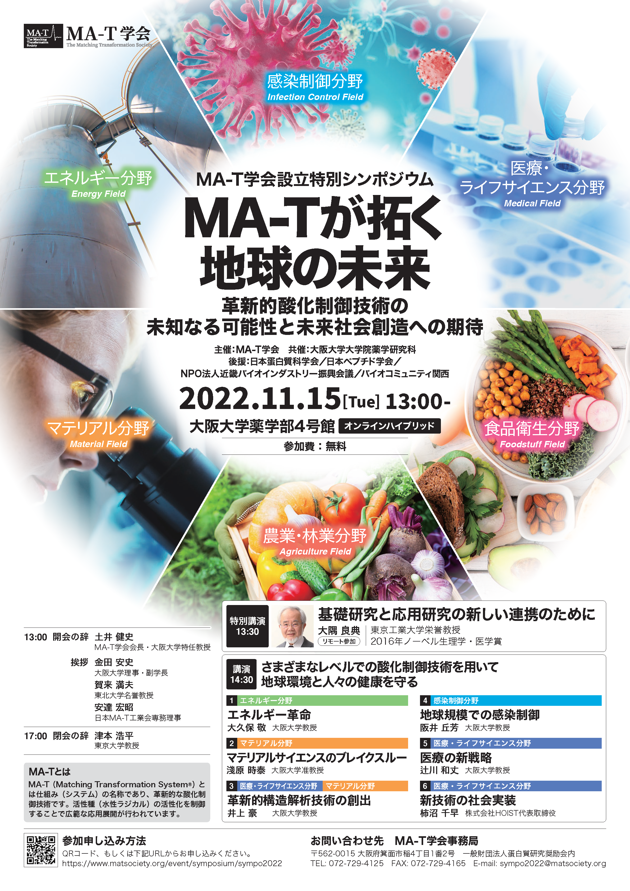 日本発の革新的酸化制御技術 【MA-T (Matching Transformation System®)】 は、感染制御、医療応用、エネルギー生産など幅広い用途への展開を通して、気候変動対策や地球環境保全、人々の健康対策を推進し、サステナブルな社会の実現に寄与 することが大いに期待されています。MA-Tの科学技術のさらなるブレークスルーを目指して、2022年2月、「MA-T学会」が設立されました。学会では、地球の未来、新しい価値を生み出す未来社会のデザインなど、基礎から応用まで多様な異分野からの多彩な研究が期待され、創造力ある研究者、才気あふれる人材の参入が求められています。 本シンポジウムでは、学会設立を記念し、2016年ノーベル生理学・医学賞を受賞された大隅良典先生に“研究に向かう開拓者の姿勢と今後への期待“を特別講演いただきますと共に、MA-Tの現状と今後の展望、研究成果の社会実装、グローバルな人材育成への期待などを紹介します。地球の未来を拓く活動にぜひご参加ください。
