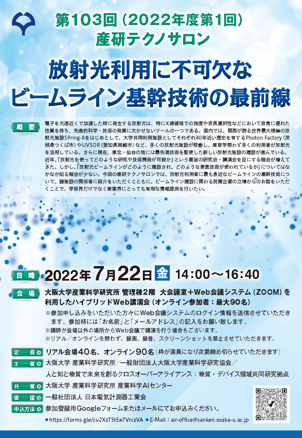 第103回 産研テクノサロン 「放射光利用に不可欠なビームライン基幹技術の最前線」