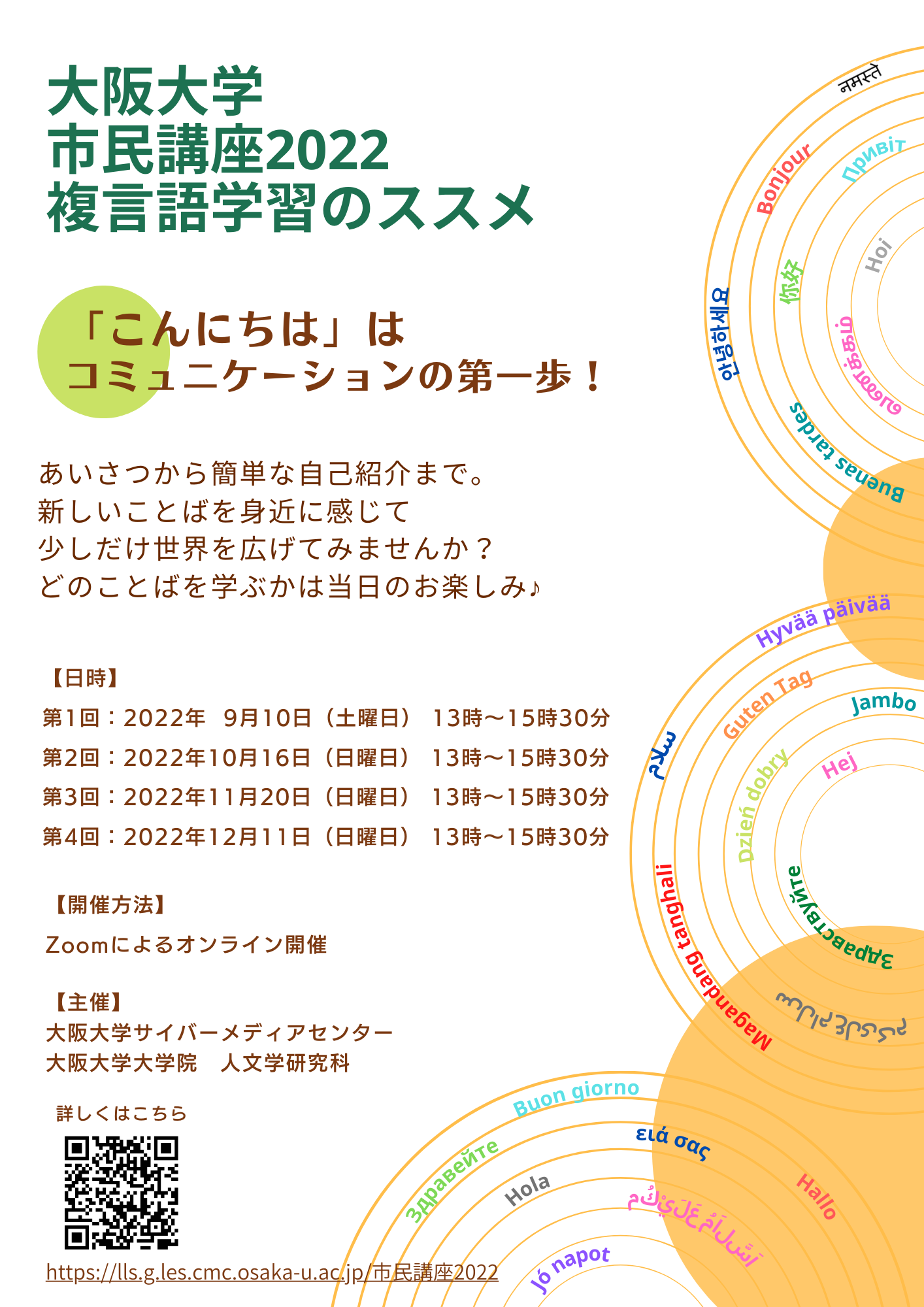 | 申し込み窓口 | https://lls.g.les.cmc.osaka-u.ac.jp/市民講座2022 |