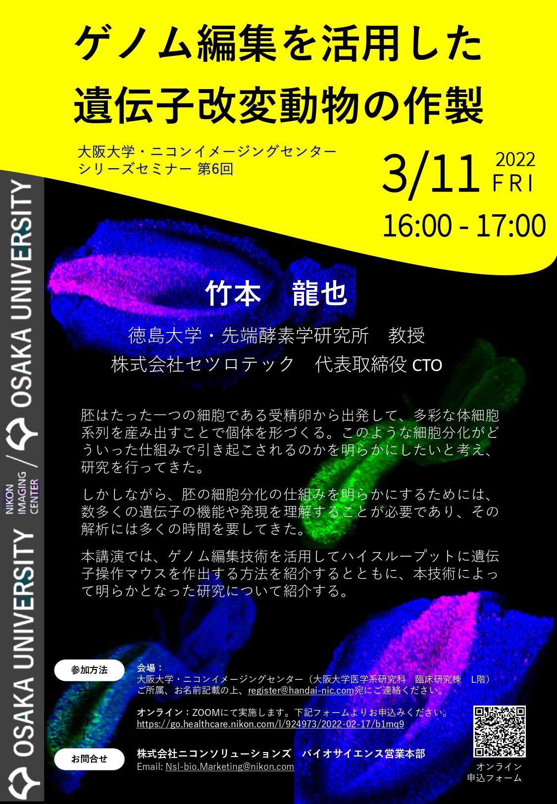 大阪大学・ニコンイメージングセンター シリーズセミナー 第6回「ゲノム編集を活用した遺伝子改変動物の作製」