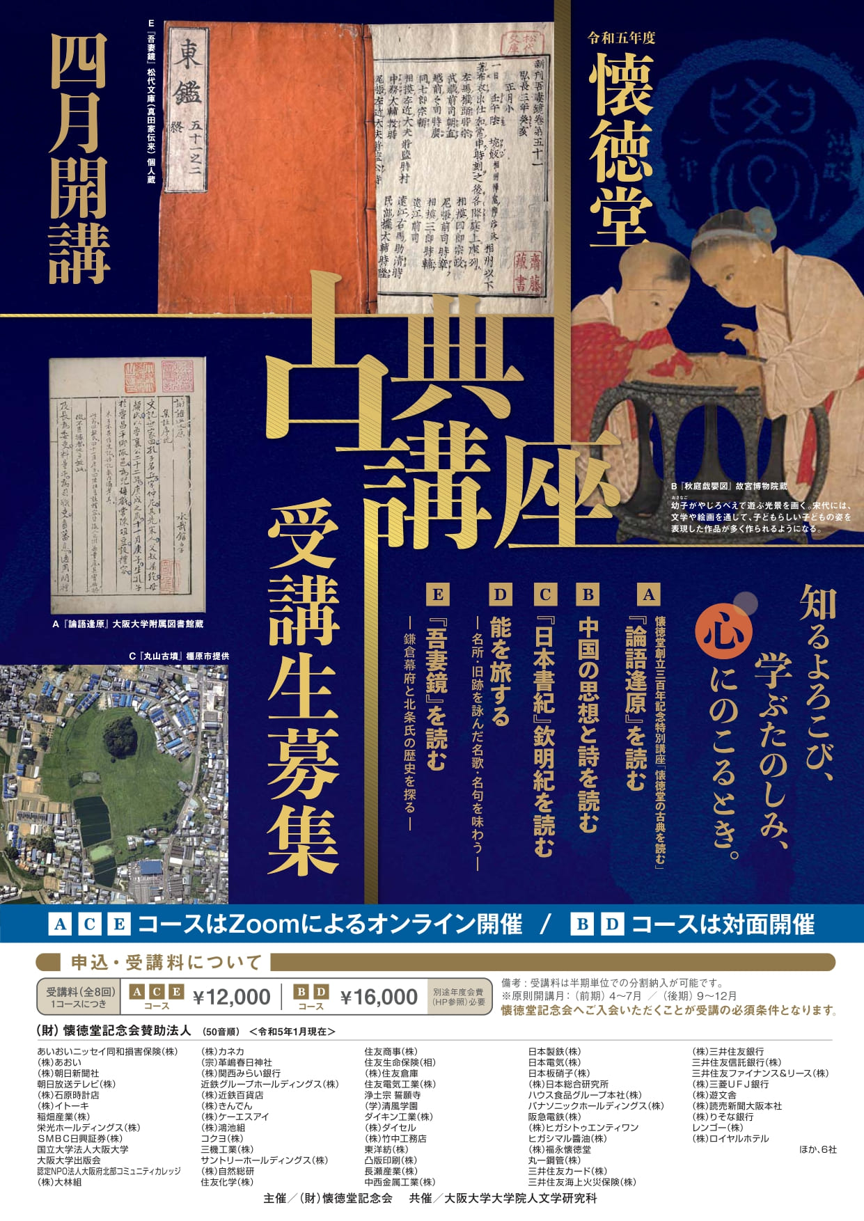 ※お申込み可能な方は、懐徳堂記念会の会員に限ります。受講料と合わせて、令和5年度年会費(個人普通会員3,000円、個人賛助会員10,000円)をご納入ください。法人会員は、受講料無料です。