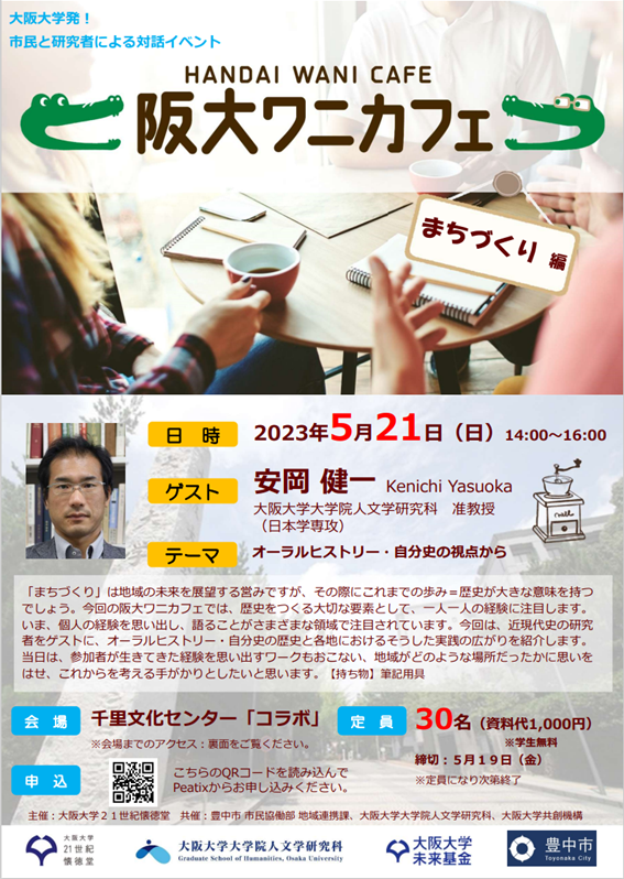 「まちづくり」は地域の未来を展望する営みですが、その際にこれまでの歩み=歴史が大きな意味を持つでしょう。今回の阪大ワニカフェでは、歴史をつくる大切な要素として、一人一人の経験に注目します。いま、個人の経験を思い出し、語ることがさまざまな領域で注目されています。今回は、近現代史の研究者をゲストに、オーラルヒストリー・自分史の歴史と各地におけるそうした実践の広がりを紹介します。当日は、参加者が生きてきた経験を思い出すワークもおこない、地域がどのような場所だったかに思いをはせ、これからを考える手がかりとしたいと思います。【持ち物】筆記用具