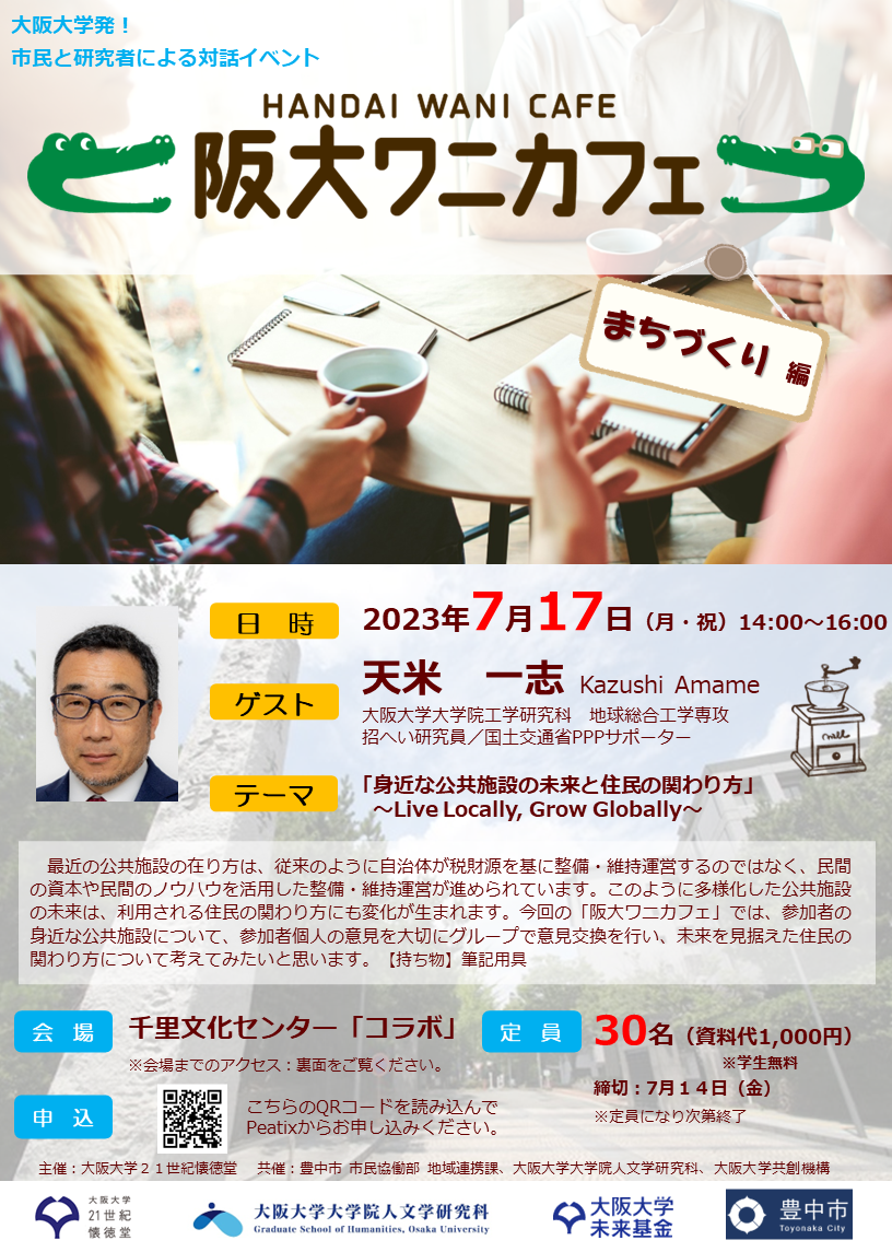 最近の公共施設の在り方は、従来のように自治体が税財源を基に整備・維持運営するのではなく、民間の資本や民間のノウハウを活用した整備・維持運営が進められています。このように多様化した公共施設の未来は、利用される住民の関わり方にも変化が生まれます。今回の「阪大ワニカフェ」では、参加者の身近な公共施設について、参加者個人の意見を大切にグループで意見交換を行い、未来を見据えた住民の関わり方について考えてみたいと思います。【持ち物】筆記用具