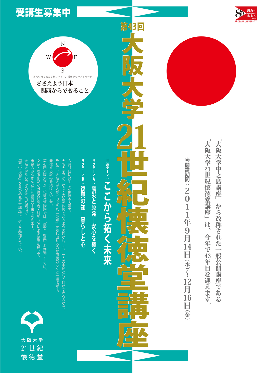 第43回大阪大学21世紀懐徳堂講座/サブテーマA 「震災と原発 -安心を築く」の申込受付中です。(8/29月~9/9金)