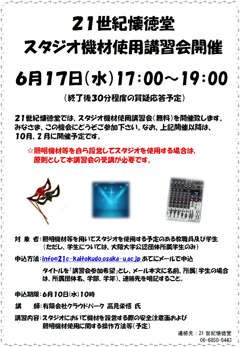 ※照明機材等を自ら設営して21世紀懐徳堂スタジオを使用する場合は、原則として本講習会の受講が必要です。