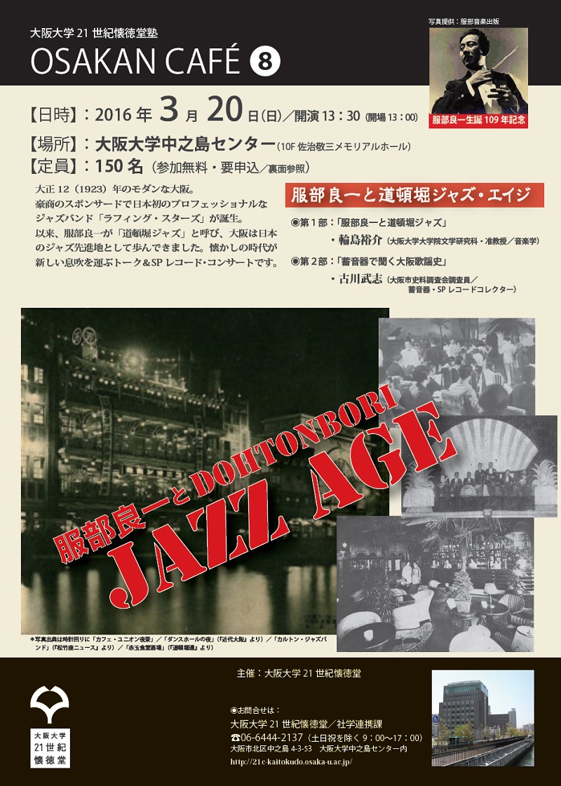 『大阪大学21世紀懐徳堂塾OSAKAN CAFÉ』は、平成25年3月から開始した21世紀懐徳堂が企画するカフェ形式のイベントで、「大阪で一番」「大阪が初めて」といった内容をとりあげています。今回は、大阪・道頓堀のジャズ音楽がテーマです。