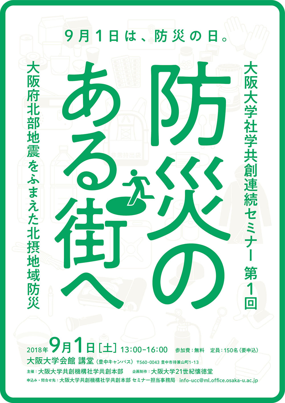 9月1日は「防災の日」。この日に合わせて全国各地で防災にまつわる様々な意匠を凝らしたイベントが実施されていた。今年7月に起きた大阪府北部地震の記憶が新しい大阪大学では、社学共創連続セミナー第1回「防災のある街へ 大阪府北部地震をふまえた北摂地域防災」を開催し、防災のある街づくりへ向けて多様な切り口から様々な意見が交換された。