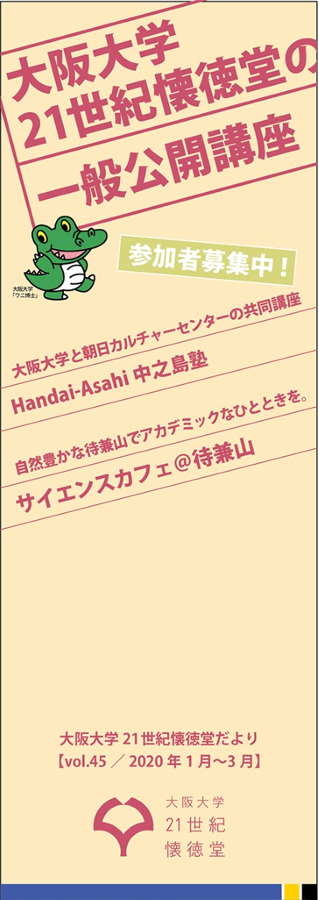 21世紀懐徳堂だよりvol.45を発行しました! 21世紀懐徳堂の活動や、大阪大学の社学連携事業についてお知らせする「21世紀懐徳堂だよりVol.45」を発行しました。 2020年1月~2020年3月開講の公開講座等のお知らせです。ぜひご一読ください。 各講座へのご参加をお待ちしております。 =====大阪大学21世紀懐徳堂だよりvol.45 contents===== ● Handai-Asahi中之島塾 ● 大阪大学 21世紀懐徳堂 i-spot講座 ● ラボカフェ ● 大阪大学シンポジウム → 中面PDFダウンロード ● Science cafe@待兼山 ● Science cafe@豊中市立中央公民館 → 外面PDFダウンロード Tweet これを送る 印刷する